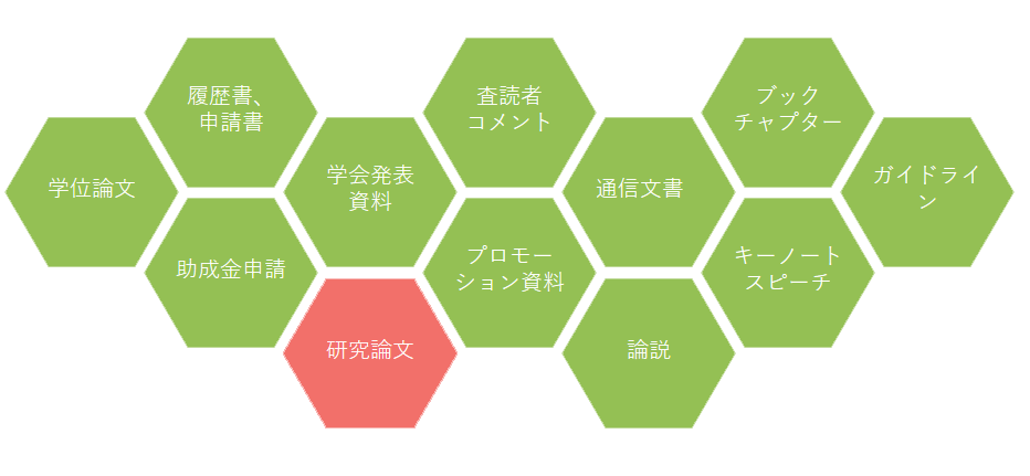 研究論文は、わかりやすく正確に、とりわけターゲットとする読者を意識して書く必要があります。私たちの翻訳者、エディター、ライターは、各分野の専門家であり、そのほとんどが自著論文の出版経験を持っています。読者が論文の言語に気を取られることなく、お客様が伝えたい重要なメッセージに集中して論文を読むことができるよう原稿を仕上げます。アブストラクト、原著論文、カバーレター、症例報告、評論、臨床試験報告、学会発表資料など、あらゆるタイプの研究論文に対応可能です。